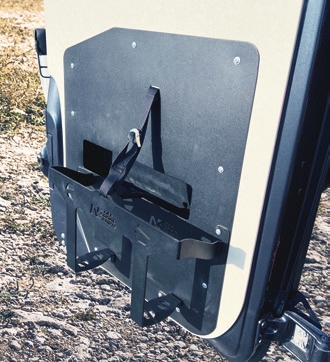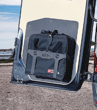 Le panneau de porte en aluminium avec vide-poche pour rangement d'objet dans la porte arrière gauche du Mercedes Sprinter W907 N4-Offroad