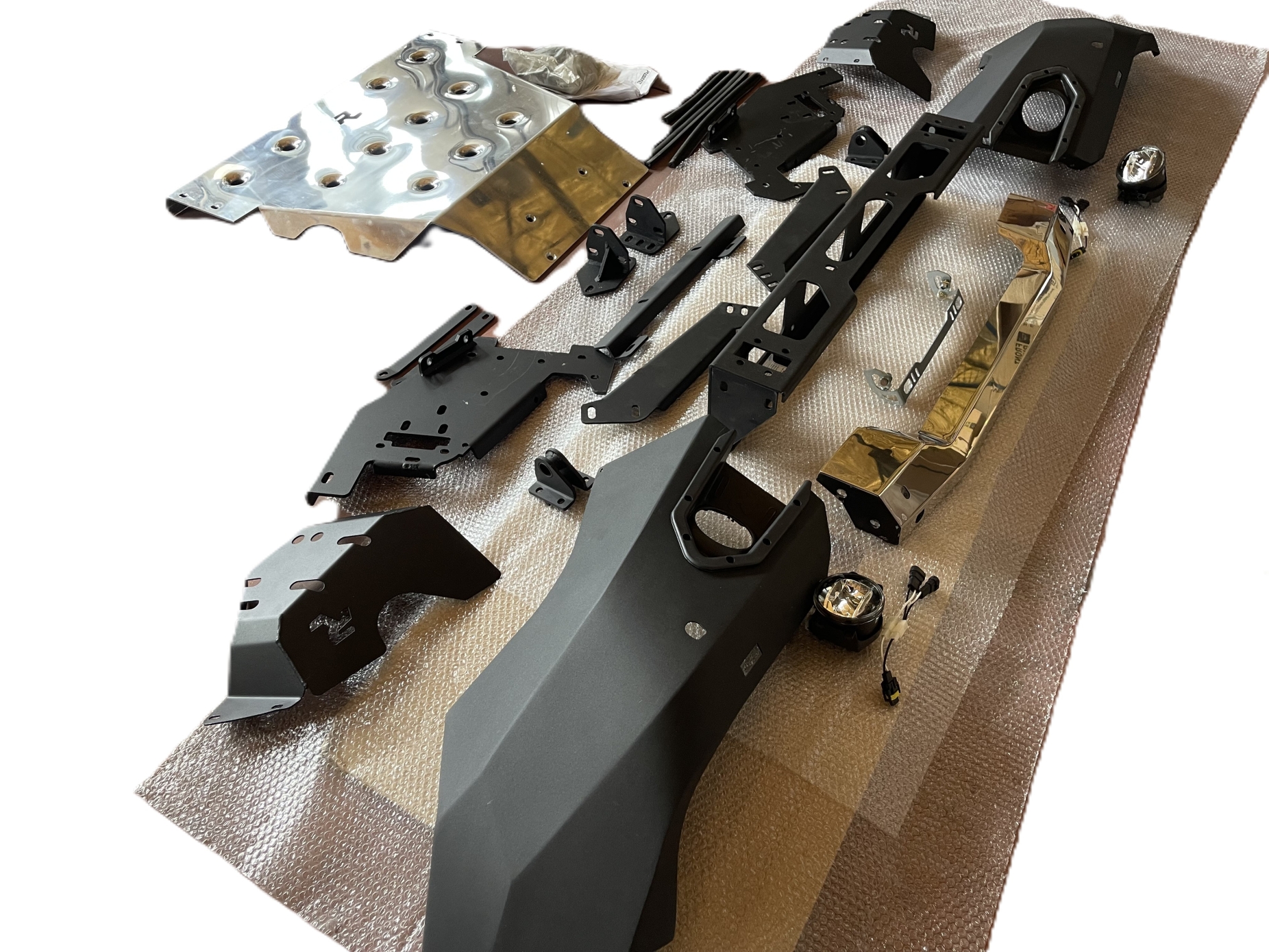 - fourni avec un blindage avant en aluminium 5 mm parfaitement adapté au pare choc et protègeant l'avant de votre véhicule