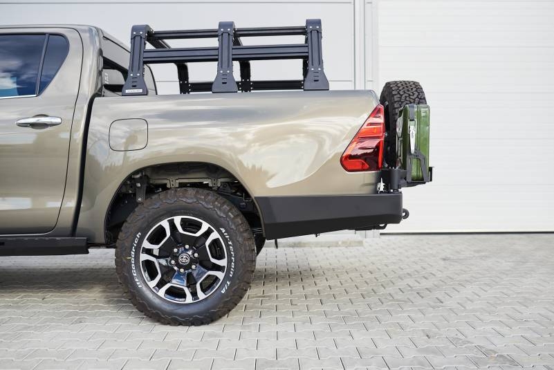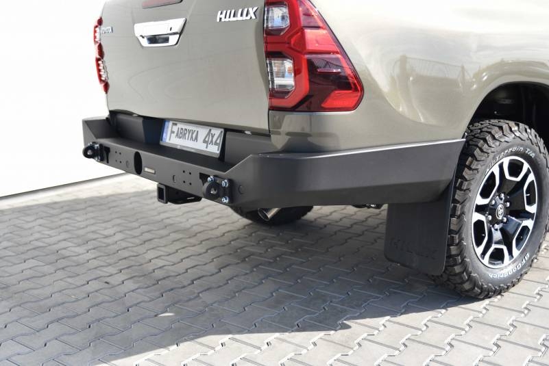 Pare-chocs arrière SANS PORTE ROUE NI PORTE JERRYCAN (en option) dédié pour HILUX REVO DE 2016 A 2019 . La structure principale du pare-chocs est en tôle de 4 mm d'épaisseur, et les fixations au châssis sont en tôle de 5 mm d'épaisseur. Le produit est d'abord découpé au laser, puis plié sur une presse plieuse CNC, et la forme correcte est obtenue lors de la finition manuelle. L'étape suivante est la protection anti-corrosion consistant en l'application d'un apprêt à la poudre de zinc, et la peinture en poudre qui donne au pare-chocs son aspect définitif.