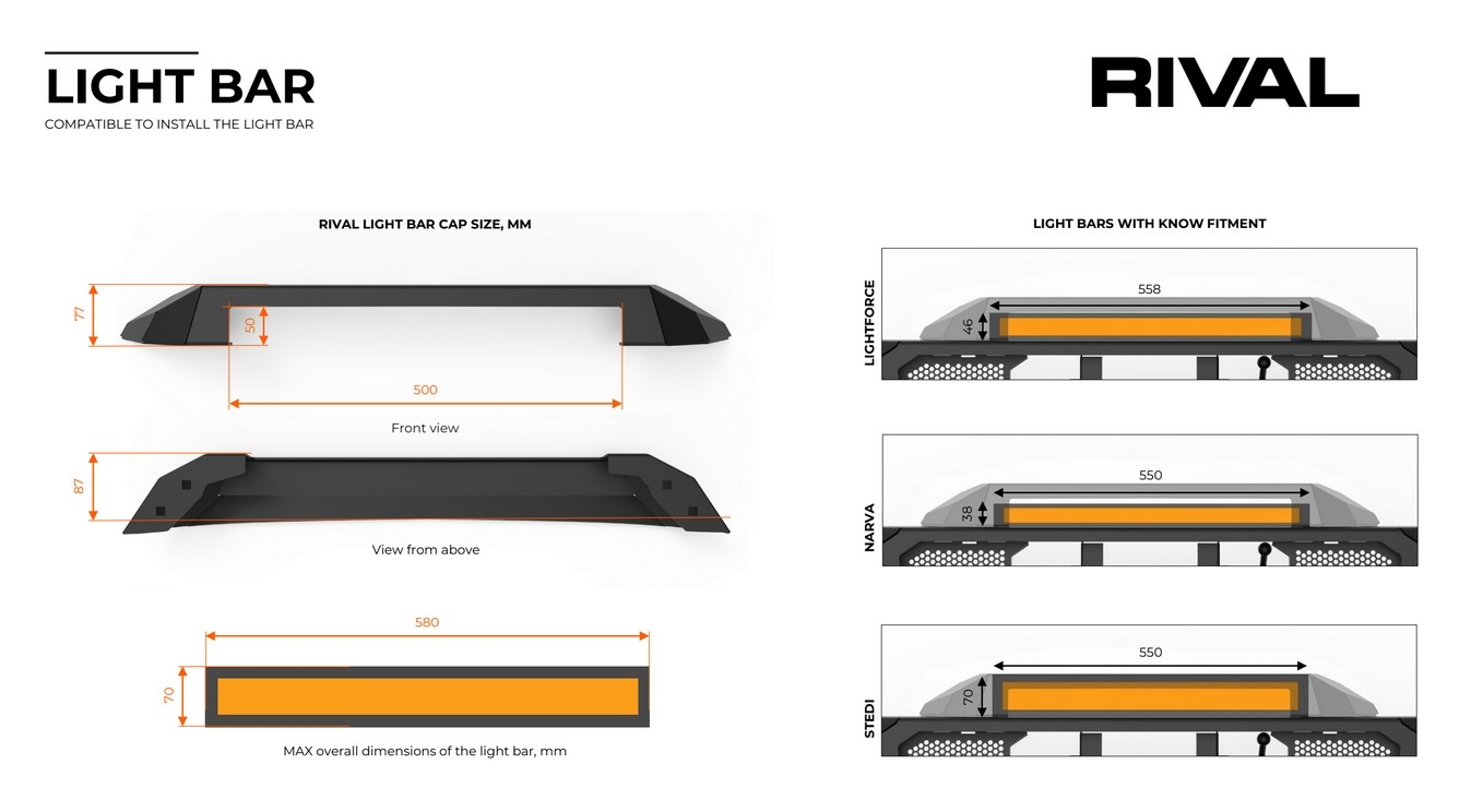 Il est bien sûr possible d'y installer un treuil (10T max) et un emplacement est déjà prévu pour une barre led (non fournie) jusqu'à 22". Deux feux LED RIVAL sont inclus dans ce pack permettant une meilleure vision nocturne ou par temps de brouillard.