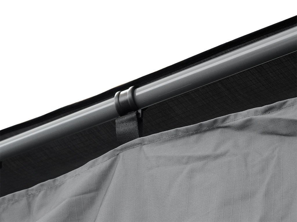 La paroi lateral pour auvent Frontrunner Easy-out de 2M et 2.5M se fixe facilement sur le côté votre Auvent Easy-Out de 2M et 2.5M de Front Runner à l'aide de sangle sur le poteau horizontal de votre auvent et se fixe solidement au sol selon l'angle souhaité grâce aux piquets