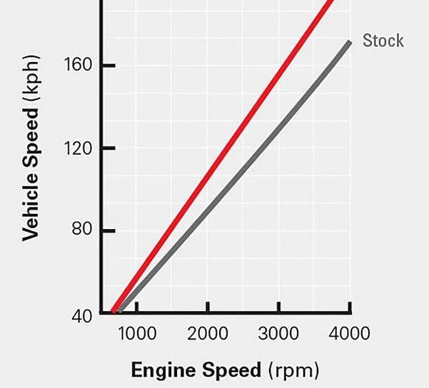 le moteur n'a pas besoin de tourner à un régime aussi élevé lorsqu'il est en 5e vitesse. La 5e vitesse TERRAIN TAMER est un remplacement direct des composants d'origine qui entraîne une diminution de 20 % du régime moteur à n'importe quelle vitesse du véhicule lorsqu'elle est en 5e vitesse. Par exemple, à 120 km/h, le régime moteur est réduit de 2870 tr/min à 2300 tr/min.