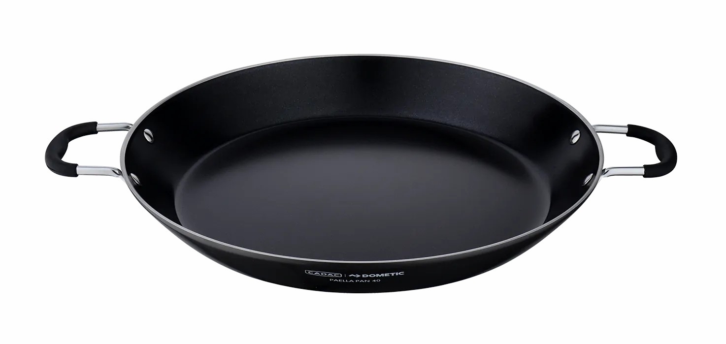 La poêle à paëlla 40 a été développée pour s'intégrer nativement dans l'écosystème CADAC | Dometic, notamment pour les gammes Carri Chef 40 et Glamp Chef 40. Elle s'installe directement sur le support de casserole de votre réchaud.