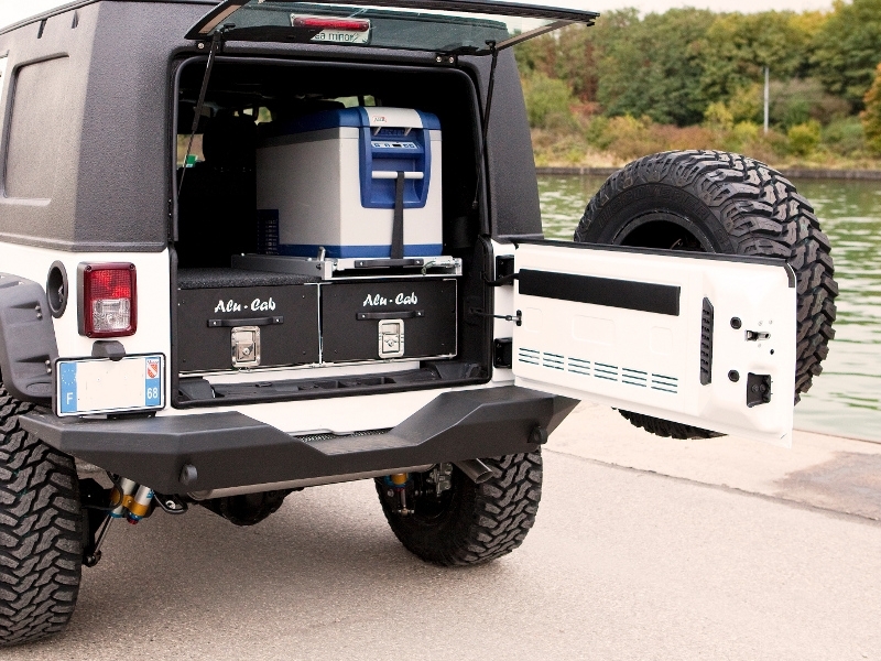 Porte-roue de secours renforcé et ajustable avec renfort de hayon pour Jeep Wrangler JK qui permet de garder l'ouverture du hayon en une seule étape.