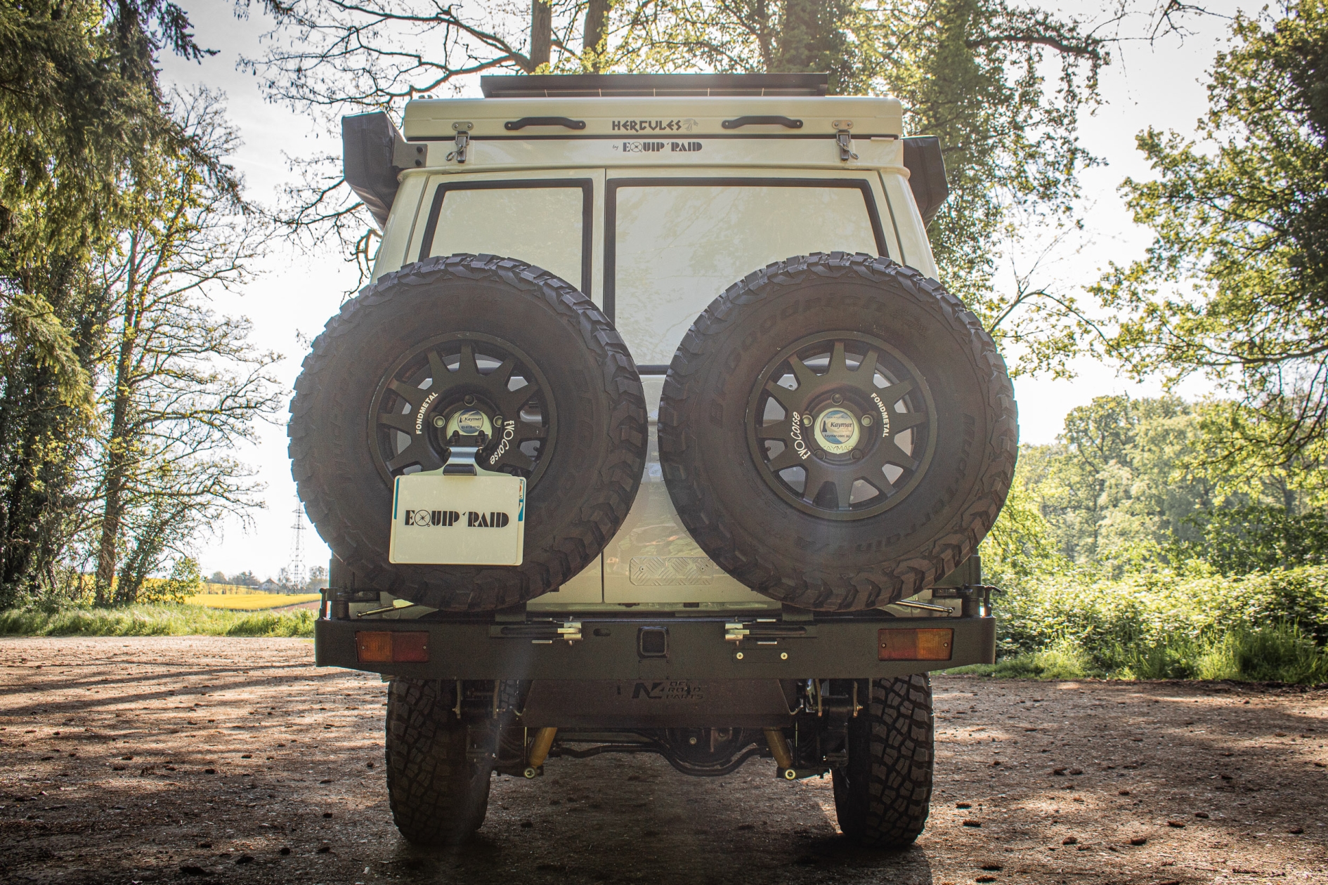 Montage côté droit. Porte roue en acier conçu spécifiquement pour le montage sur pare chocs Kaymar. Le montage se fait via deux roulements coniques sur le pivot du pare chocs. Verrouillage ferme et fiable au centre du pare chocs. Ouverture assistée par vérin à gaz. Système antivol de la roue. Livré complet avec kit de montage, notice et visserie. Peint epoxy noir.