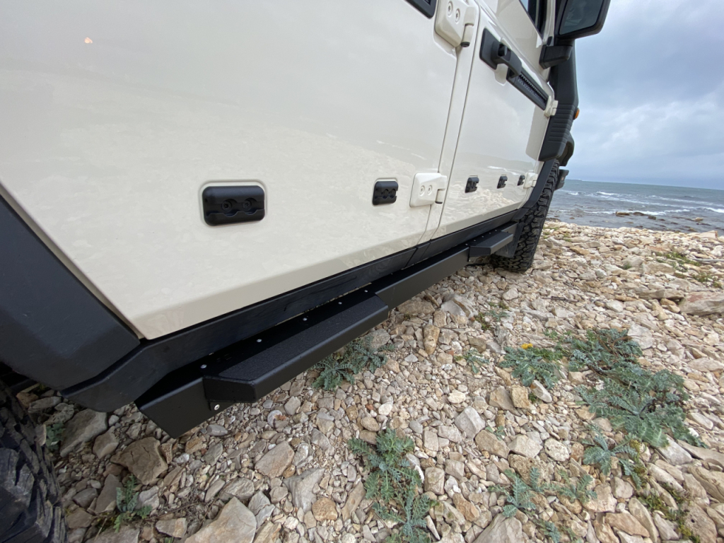 Trous latéraux pour utilisation accessoires de lavage Hi-LiftAttention sur la photo du Grenadier beige, la paire de protections de bas de caisse MPMT232 est équipée de l'option N4-MP200 (non-inclus avec les protections latérales).