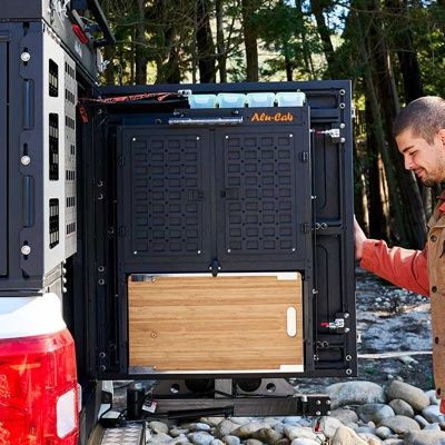 La cuisine Alu-Cab ModCAP : votre propre repas sur roues ! La cuisine Alu-Cab ModCAP offre un espace de rangement et de préparation polyvalent équipé de tout ce dont vous avez besoin pour préparer des repas gastronomiques en plein air. Doté d'un design élégant et compact !