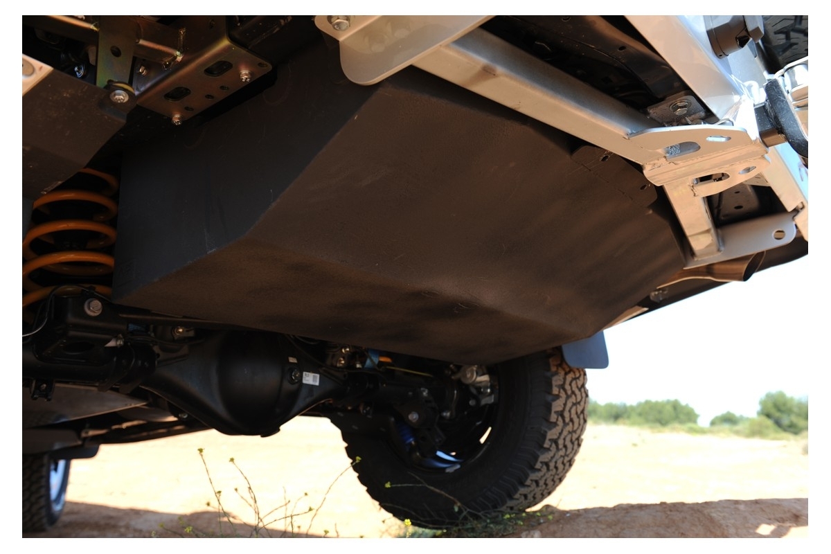 Réservoir supplémentaire de 130L qui vient se positionner sous le plancher AR à la place de la roue de secours. Compatible avec suspension active KDSS. Réservoir en acier avec cloisonnement et peinture époxy. Le remplissage se fait par l'orifice d'origine avec ajout d'un Y entre la goulotte et le réservoir d'origine. Une pompe gros débit assure le transfert de carburant du réservoir additionnel au réservoir d'origine. Montage sans modification de votre véhicule à l'exception de la goulotte d'origine.