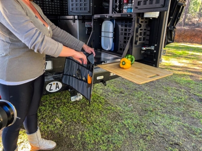 Grâce à ses crochets intégrés, vous pouvez facilement le suspendre à votre table rabattable ou à un support sur votre campement. C'est le compagnon indispensable pour cuisiner efficacement, même au milieu de nulle part !