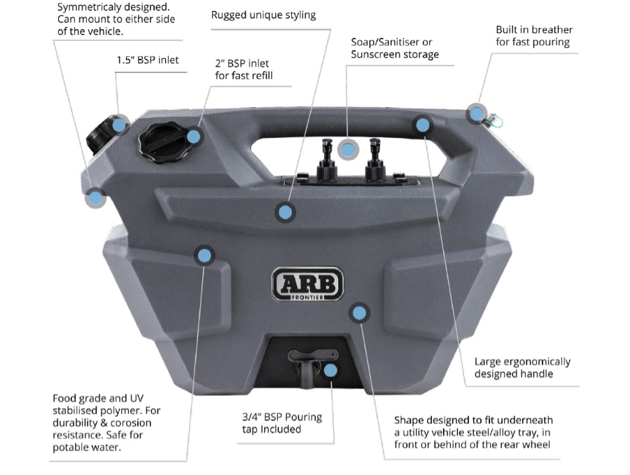 - Polymer Alimentaire et Résistant aux UV : La ARB Frontier est fabriquée à partir de polymère de qualité alimentaire résistant aux UV, assurant une durabilité exceptionnelle et une résistance à la corrosion. Elle est parfaitement sûre pour le stockage d'eau potable.