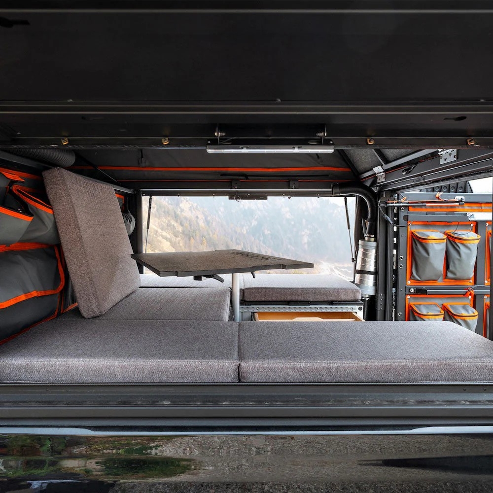 La table Lagun est pliable et rotative. Elle s'adapte parfaitement à l'aménagement intérieur Tailgate Gear de votre Modcap et de votre CAnopy Camper.