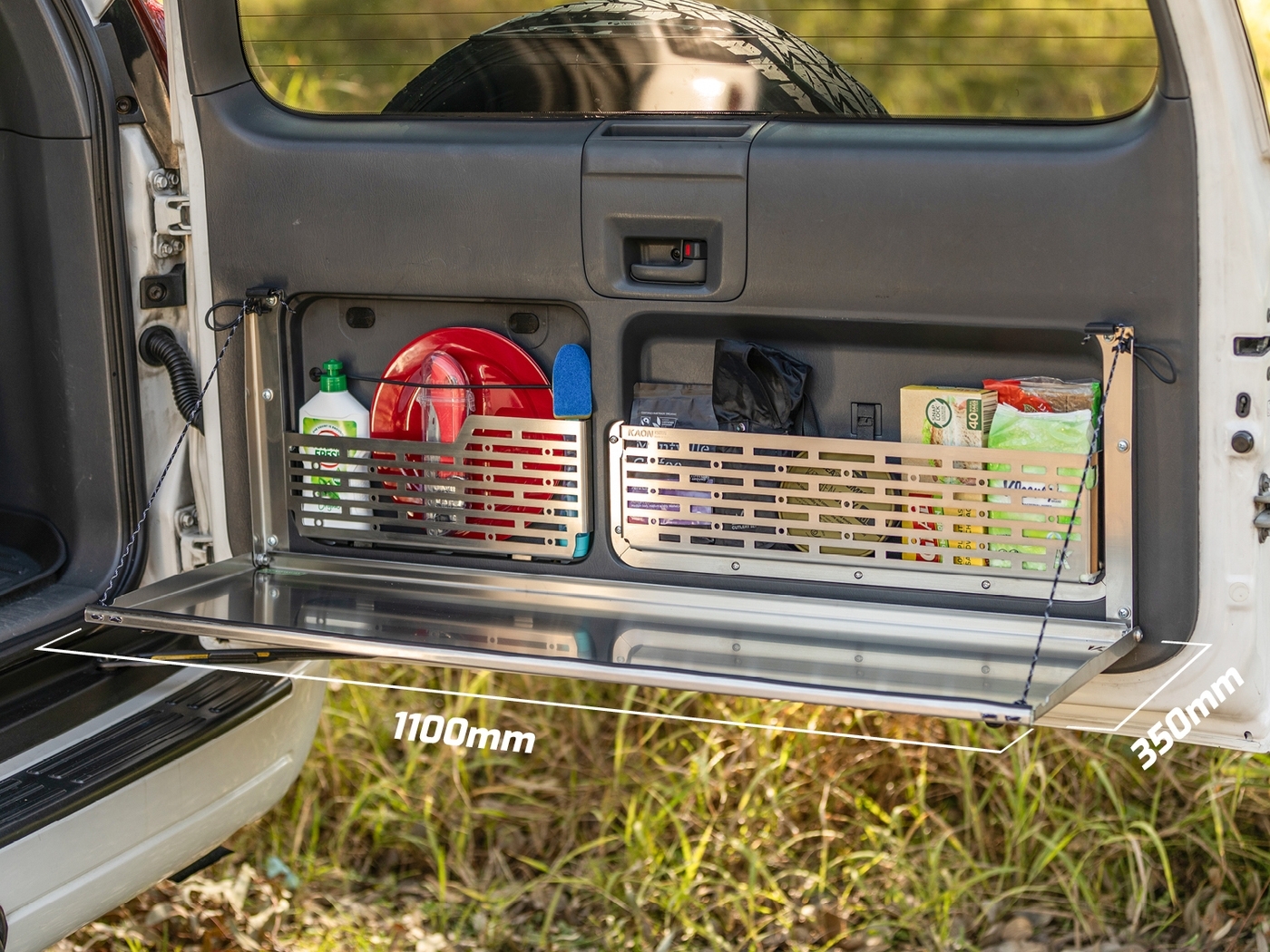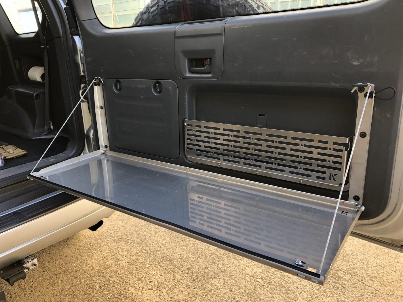 Transformez la porte arrière de votre ToyotaPrado ou GX 470 en un véritable poste de travail ou en cuisine de campagne mobile avec la Tablette Kaon escamotable et cage pour porte arrière.