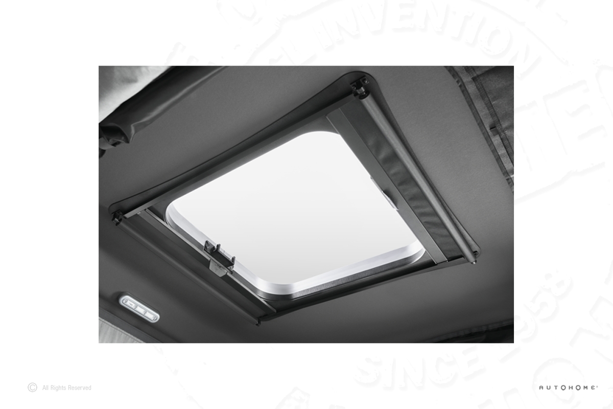 La fenêtre supérieure (taille 70x60 cm) est parfaitement intégrée dans le design de la coque et peut être soulevée pour créer une fente partielle, ou être complètement ouverte à 90°, afin de permettre à une personne de se tenir debout dans la tente et de regarder depuis l'ouverture.