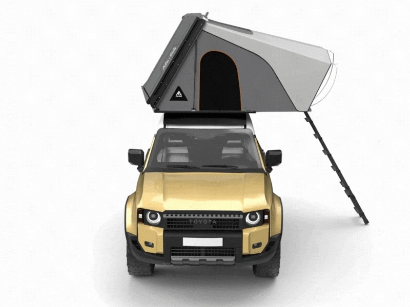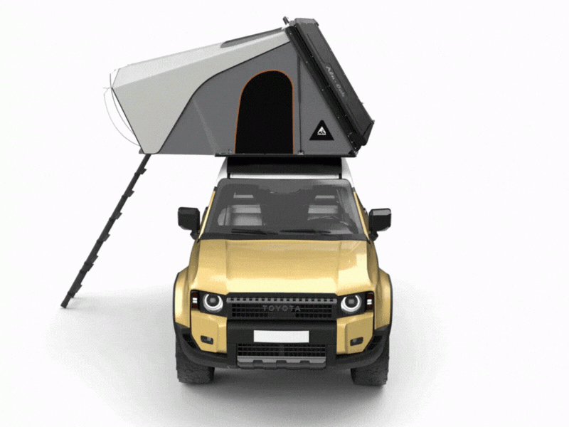 Ouvrir la tente ne prend qu'une minute : relevez la coque, déployez avec l'échelle, verrouillez la plateforme et fixez le toit de pluie — c'est prêt ! Grâce à sa conception symétrique, vous choisissez l'orientation de l'ouverture selon votre véhicule ou votre aménagement. Placez l'entrée de la tente à droite ou à gauche de votre véhicule selon votre gout et vos accessoires déjà installés.