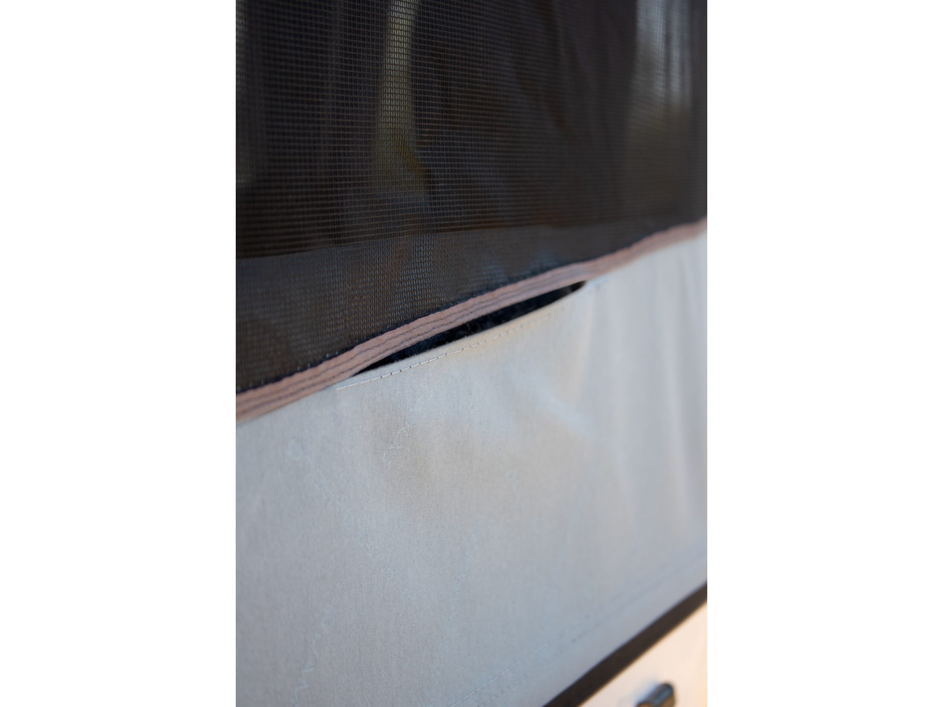 Ce modèle intègre la toile de la gamme Evolution, un textile aluminisé à trois couches exclusif à James Baroud. Ce matériau technique offre une isolation phonique et thermique supérieure, réfléchissant les rayons solaires pour maintenir une température régulée à l'intérieur.