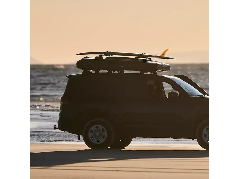 - La fixation sur le véhicule se fait au moyen de deux rails aluminium incorporés dans la coque inférieure et de 6 pattes de fixations. De par sa conception, différentes largeurs de fixation sur les barres de toit du véhicule sont possibles allant de 560mm à 100mm. Le véhicule sur lequel sera équipé la tente doit être pourvu de barres de toit transversales.