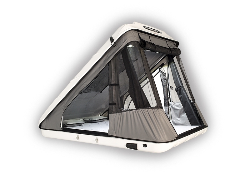 Fabriquées en polyester armé de fibres de verre finition Gelcoat. Deux prises d’air, équipées de filtre à poussière, améliorent la ventilation intérieure de la tente. La coque supérieure aérodynamique est équipée d’un aileron arrière. Le verrouillage des deux coques est assuré par deux fermetures ajustées sur mesure, avec sécurités.