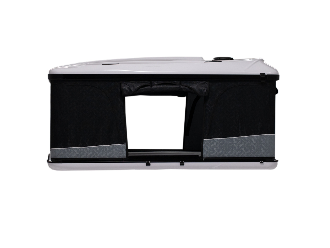 - La fixation sur le véhicule se fait au moyen de deux rails aluminium incorporés dans la coque inférieure et de 6 pattes de fixations. De par sa conception, différentes largeurs de fixation sur les barres de toit du véhicule sont possibles allant de 560mm à 100mm. Le véhicule sur lequel sera équipé la tente doit être pourvu de barres de toit transversales.