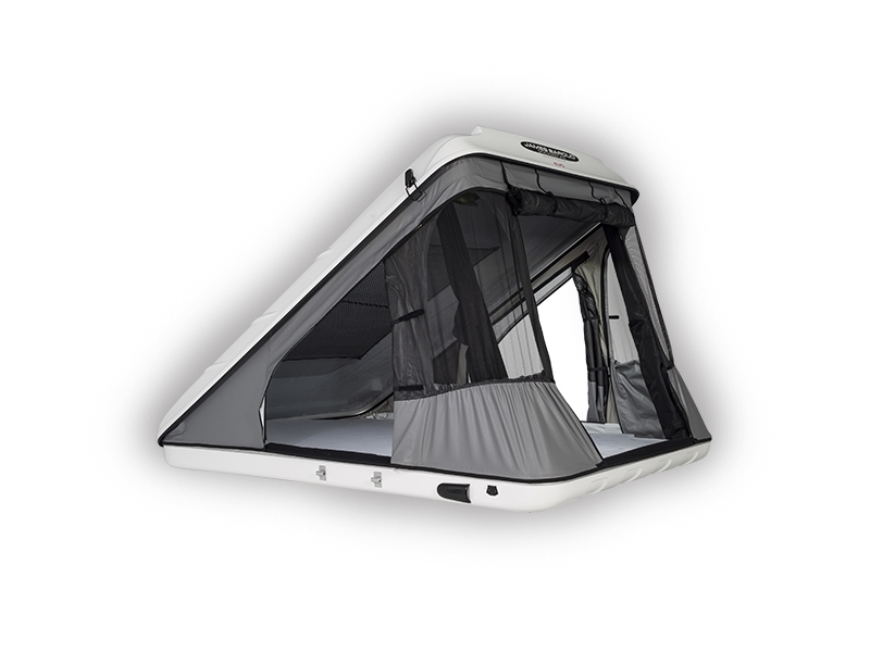 Fabriquées en polyester armé de fibres de verre finition Gelcoat. Deux prises d’air, équipées de filtre à poussière, améliorent la ventilation intérieure de la tente. La coque supérieure aérodynamique est équipée d’un aileron arrière. Le verrouillage des deux coques est assuré par deux fermetures ajustées sur mesure, avec sécurités.