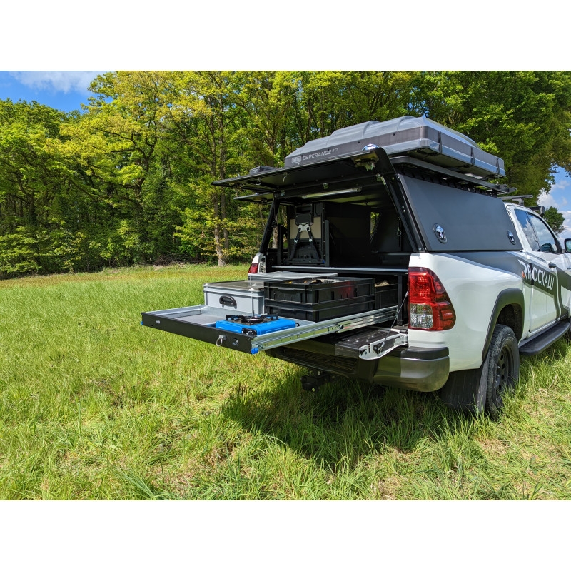Grâce à un système breveté, le bloc tiroir ROCKALU s'adapte à tous les pick-up xtra-cab du marché grâce à ses rails latéraux réglables en largeur.