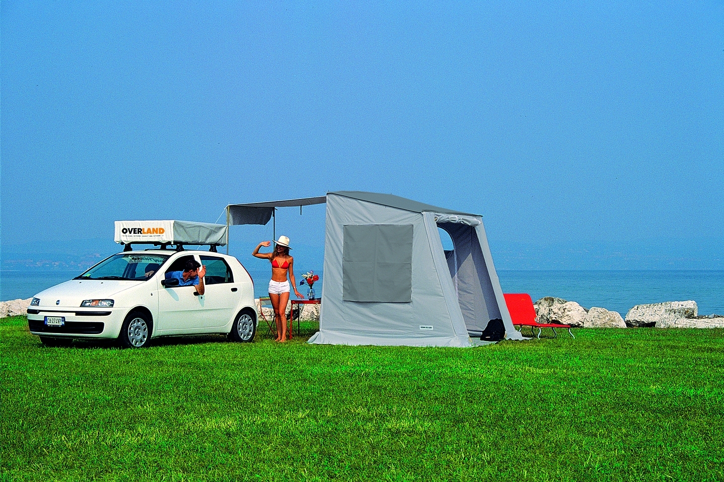 Les indications et l’expérience de nos testeurs nous ont poussés vers un choix raisonné: la véranda Overland doit être elle aussi indépendante. La zone nuit et la zone jour, même jointes, restent des structures séparées: c’est la solution idéale pour exploiter les caractéristiques de liberté de déplacement tout en ayant une base de stationnement où laisser les tables, les chaises, le barbecue, la nourriture, etc. Quand la halte est prolongée, l’accouplement avec les pieds au sol (art. OL/06A) transforme la tente en un module articulé, accueillant et sûr pour des vacances sous le signe du camping traditionnel.