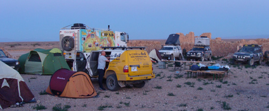 Après une douce nuit, de délicieuses crêpes cuites au feu de bois par Fatima les confitures faites maison, l'orange pressée et le thé à la menthe, nous reprenons les pistes du moyen atlas pour nous diriger vers l'oued Moulouya situé à 250km plus au sud où nous installerons notre bivouac pour passer la nuit à la belle étoile. Nous traversons tout d'abord une forêt de chênes liège « déshabillés » à hauteur d'homme, puis celle, majestueuse de cèdres géants. Les paysages que nous traversons sont grandioses et variés. Après notre déjeuner au bord de l'eau, nous allons jouer avec la neige à 2500m d'altitude, avant de poursuivre notre route qui se perd dans des endroits plus secs, plus vastes, plus désertiques, plus caillouteux et un peu plus chaud. Il fait nuit quand nous arrivons au vieux fort qui nous prêtera ses ruines pour installer le bivouac. Pendant que les uns bataillent avec des piquets et des toiles d'autres d'un clic déplient les tentes de toit. Les plus rapides donnent un coup de main pour installer les bancs et les tables. Patrick, le cuistot nous mitonne une bonne blanquette de veau avec son riz comme il se doit, pendant que Claude nous offre l'apéro. Il fête ses 60 ans aujourd'hui et rien ne manque ; une bonne dizaine de bouteilles différentes côtoient le saucisson, les olives et les bretzels. Eh oui, que ferions-nous sans le camion d'assistance ! Il sert au transport du matériel nécessaire au bivouac, de l'outillage pour les diverses réparations, du frigo et des précieuses bouteilles qui nous permettent de fêter dignement cet anniversaire qui restera dans nos mémoires à tous. Merci pour ce soutien logistique.